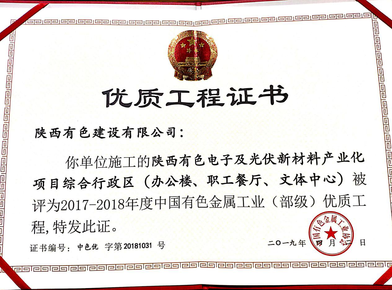 6月11日中國有色金屬工業(yè)協(xié)會(huì)召開2019年度有色金屬工業(yè)建設(shè)工程質(zhì)量監(jiān)督工作會(huì)議,表彰2017-2018年度中國有色金屬工業(yè)(部級)優(yōu)質(zhì)工程。公司承建的陜西有色電子及光伏新材料產(chǎn)業(yè)化項(xiàng)目綜合行政區(qū)Ⅰ標(biāo)段:1#-4#公寓樓,綜合行政區(qū)Ⅱ標(biāo)段:辦公樓、職工餐廳、文體中心項(xiàng)目被評為2017-2018年度中國有色金屬工業(yè)(部級)優(yōu)質(zhì)工程。
