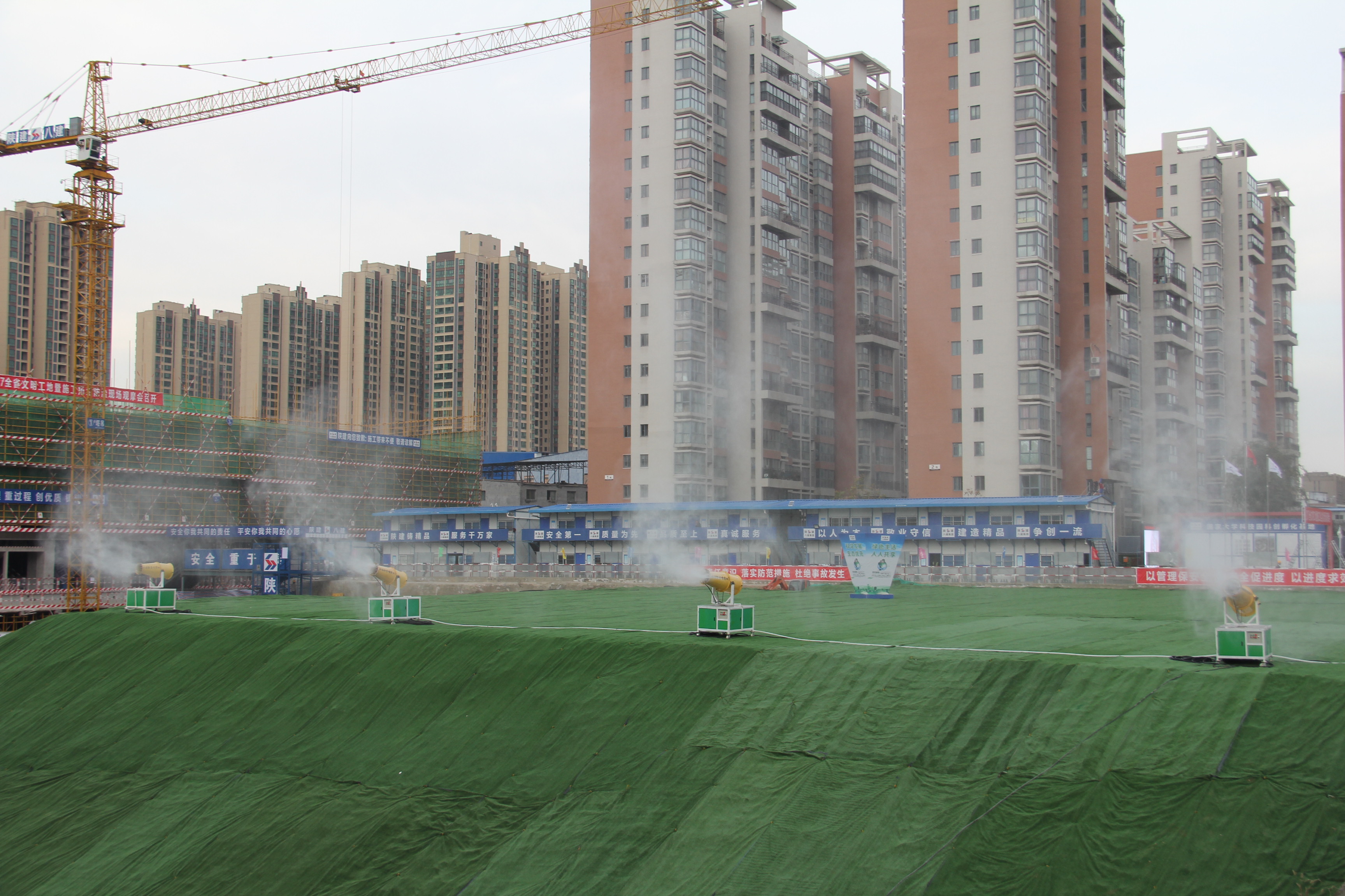 根據(jù)活動安排,大家先后參觀了兩個項目的辦公區(qū)、生活區(qū)和生產區(qū)。其中,陜西建工第八建設集團有限公司國家科技園孵化器基地項目的高壓降塵噴霧系統(tǒng)、基坑和道路雙向噴淋系統(tǒng)、工具式隔音墻、圍墻垂直綠化、活動房屋面雨水回收系統(tǒng)、三級沉淀池、紅外三聯(lián)動洗車臺、LED燈帶、BIM深化設計、VR安全教育體驗等施工亮點突出,大家一邊聽講解員的講解,一邊用手機拍攝現(xiàn)場圖片,有的還親自體驗了VR安全教育,充分領略了現(xiàn)代化科技在工程建筑方面的先進成果。據(jù)介紹,該項目綠色施工方面成績斐然,榮獲了西安市雁塔區(qū)“治污減霾樣板工地”稱號。緊接著,大家還對陜西建工第二建設集團有限公司新開門南路市政工程的智慧工地管理平臺、BIM技術、聯(lián)網式自動噴淋系統(tǒng)、太陽能平板集熱洗浴系統(tǒng)、環(huán)保遠程門禁監(jiān)控系統(tǒng)等一系列新型技術進行了觀摩學習。