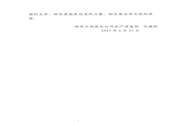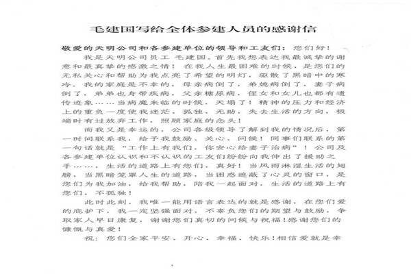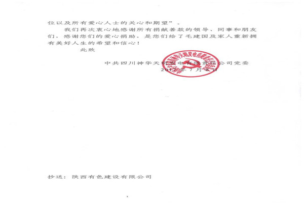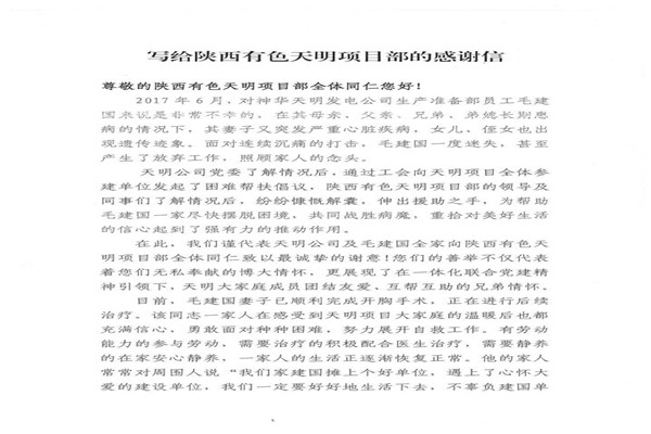 信中指出,神華天明發(fā)電公司員工毛建國家人長期患病,妻子又突發(fā)嚴重的心臟病,讓原本不富裕的家庭更是雪上加霜。在了解到相關情況后,神華天明項目部負責人高度重視,積極開展愛心捐款活動,為毛建國一家伸出了援助之手,幫助其度過難關。